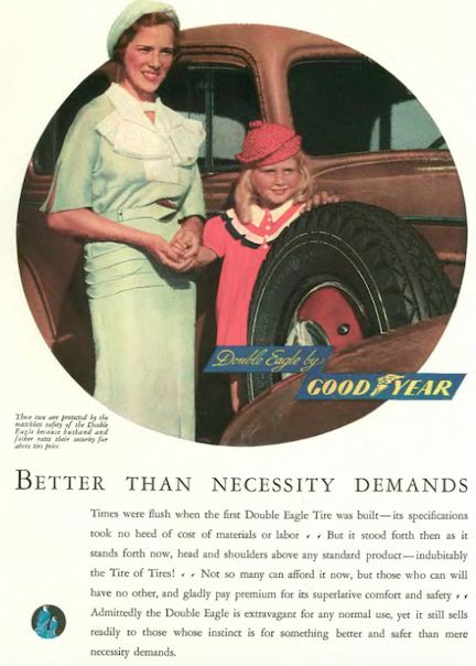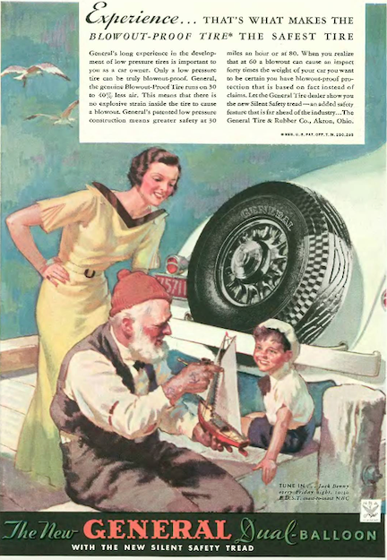 …popular were these Rockwellian ads that equated various products with happy and wholesome (and safe) living, in this case a massive “Dual-Balloon” tire that dominated this tableau featuring a stylish mommy and her little boy slumming with an old sea salt…
