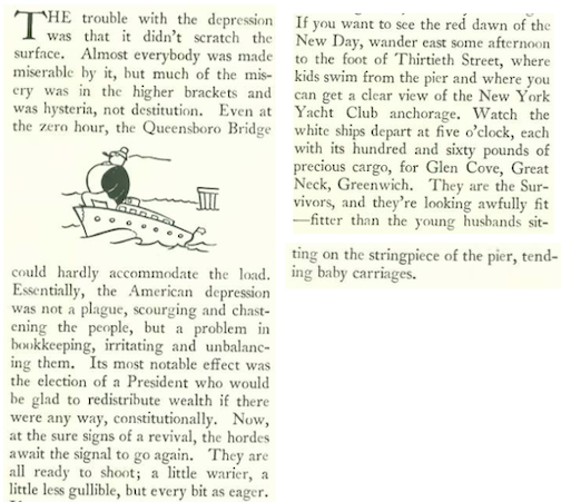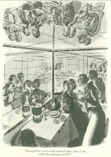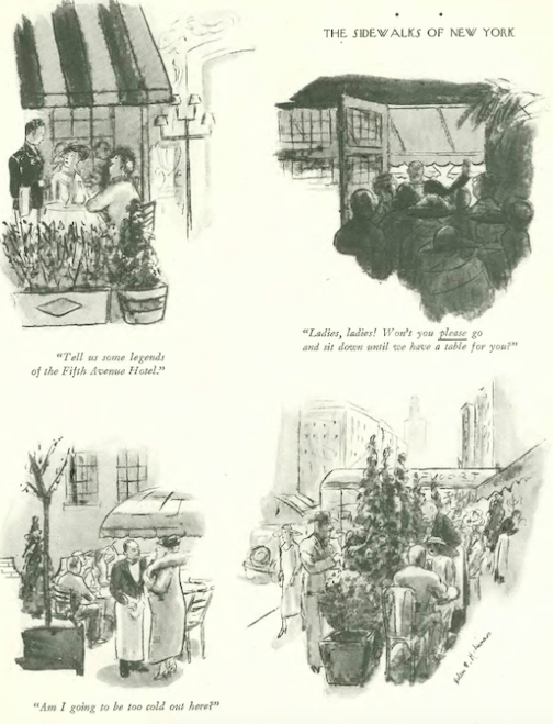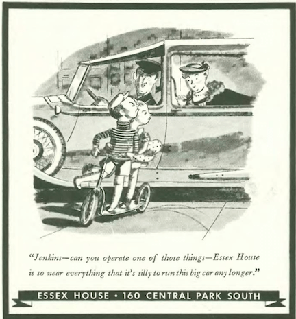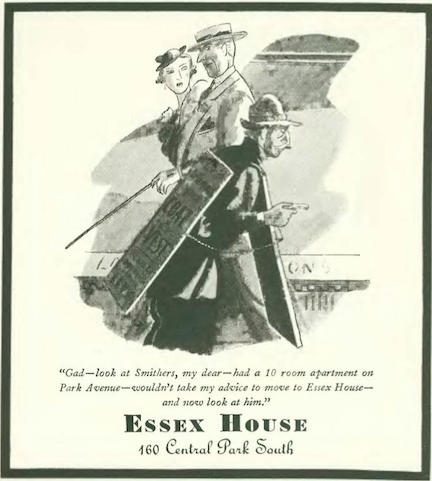 …the folks at Essex House hired an illustrator who did his or her best to channel Helen Hokinson and William Steig for this New Yorker ad…as we have seen before, Essex House ads walked a fine line between thrift and snob appeal…
