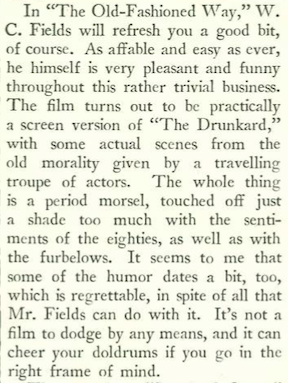 W.C. Fields appeared in more than a dozen silent films before making his first talkie, 1930’s The Golf Specialist, and it was in sound films that Fields was able to truly express his vaudevillian wit. It was also in the sound era that Fields teamed up with Baby LeRoy for three films (in 1933 and 1934), including The Old Fashioned Way, in which Fields portrayed “The Great McGonigle,” leader of a traveling (and perpetually underfunded) theater troupe who was always a step ahead of police and creditors. Critic John Mosher found the film’s riff on an old morality play, The Drunkard, to be a bit dated, but overall thought it a cheerful diversion.