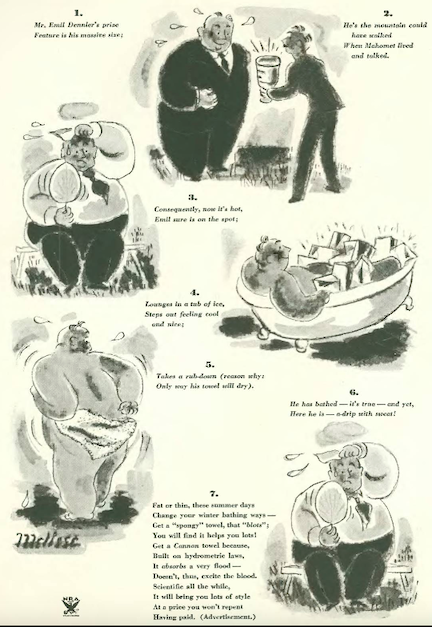…Mildred Oppenheim Melisse was a popular illustrator of ads for department stores and various household goods, including Cannon towels, here guaranteed to absorb even this man’s sweaty “flood”…