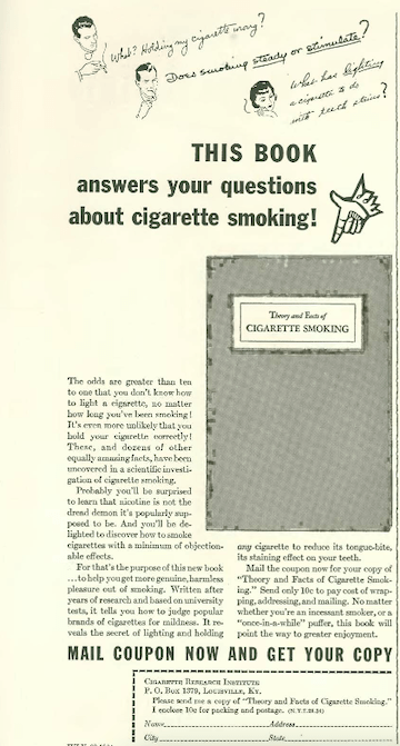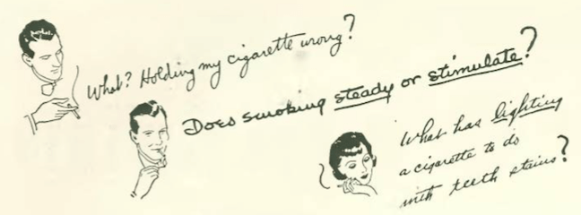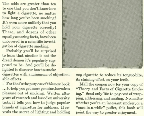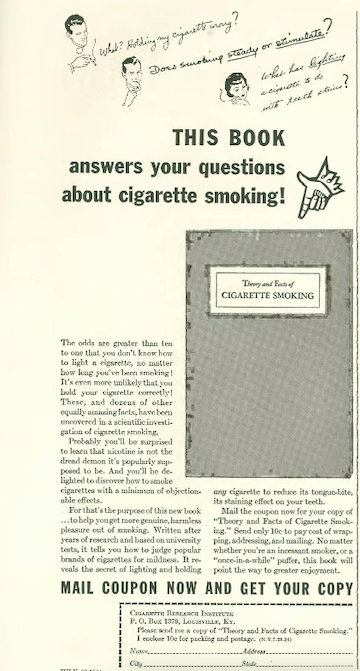 …the booklet was filled with “amazing facts” uncovered in a “scientific investigation,” facts did not address the health effects of smoking, but rather such important topics as how to hold a cigarette the right way and how to reduce staining on your teeth…it also helpfully debunked the notion that nicotine was a “dread demon”…