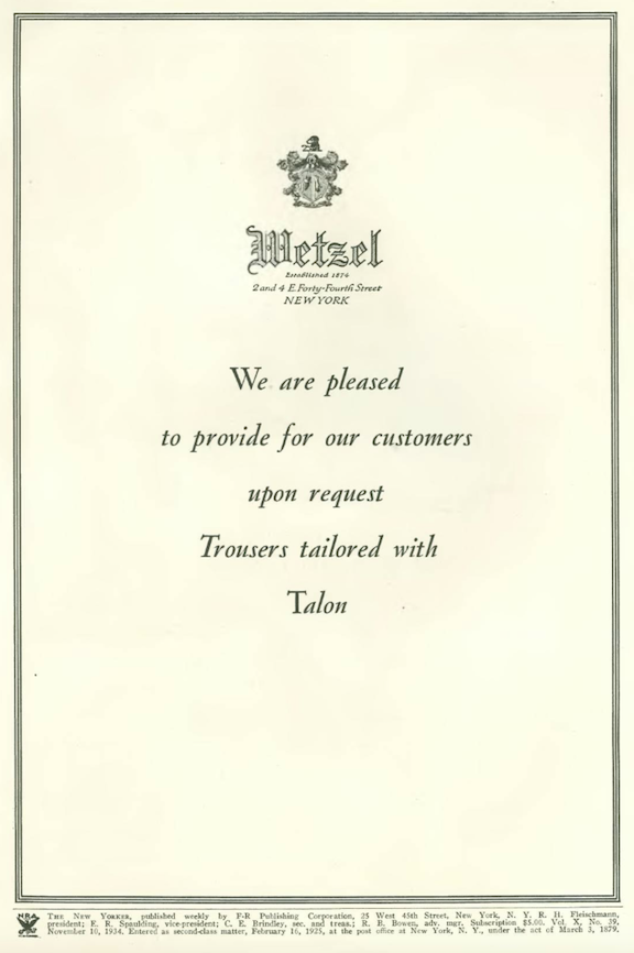 The common zipper was a relatively new invention in 1934. It had been more or less perfected by 1920, and in 1923 the B. F. Goodrich Company would coin the onomatopoetic word to describe the newfangled fastener on its galoshes, but it would take a while for the fashion industry to adopt the zipper as a replacement for buttons on garments, including men’s trousers. And so we get this staid-looking ad from Wetzel that signaled its entry into the brave new world of zippers (Talon was the dominant U.S. producer of zippers for many years)…
