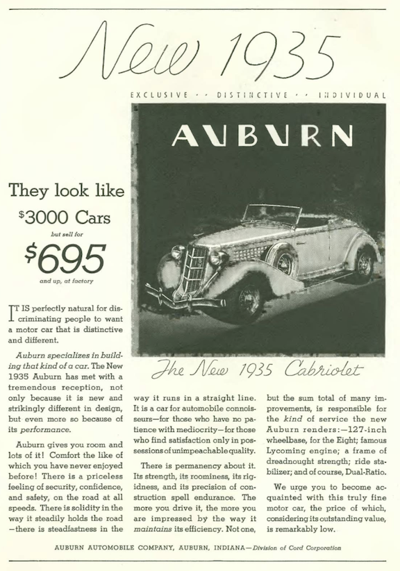 …this next ad is kind of amazing, a 1935 Auburn for only $695, which roughly translates to $15,000 or so today—still a bargain…known for cars that were fast, good-looking and expensive (and favored by Hollywood elite), Auburn struggled mightily during the Depression…along with its sister marques Duesenberg and Cord, the company would fold in 1937…