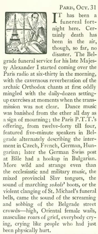 Paris correspondent Janet Flanner offered some thoughts about the incident in her “Paris Letter.” Excerpt: