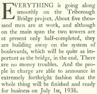 In his “A Reporter at Large” column, Morris Markey sang praises for the Triborough Bridge project, which was making visible progress on the massive public work that commenced in 1930. City officials had dreamed for years about a project that would at once connect Manhattan, Queens and the Bronx, but it wasn’t until the power broker Robert Moses got involved as the Triborough Bridge and Tunnel Authority chairman that things really started to move. Moses biographer Robert Caro wrote that “Triborough was not a bridge so much as a traffic machine, the largest ever built.” A brief excerpt: