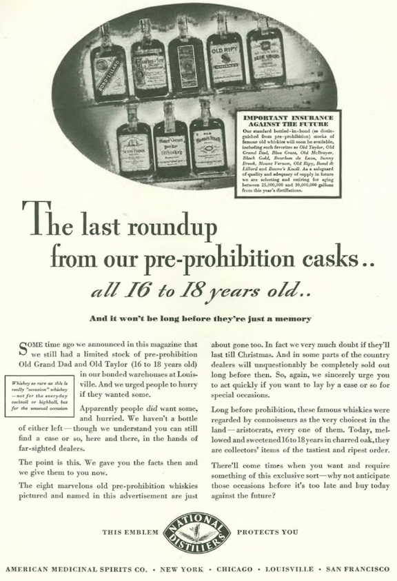 …during Prohibition distillers were allowed to keep stocks of whiskies produced before the 18th Amendment went into force…some of these were distributed through pharmacies during Prohibition for “medicinal purposes”…what was left over was sold after repeal, a stock of “pre-prohibition casks” that would be exhausted before Christmas, or so the ad rather alarmingly suggested…