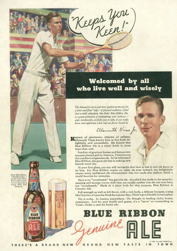…we first met tennis star Ellsworth Vines Jr a few issues ago when he was touting the health and energy benefits of Camel cigarettes…here he promotes an unlikely “stimulant”—Pabst Blue Ribbon ale…Vines testified that “the demand for more and more speed in sports calls for a finer and finer ‘edge’ of physical condition” and observed that PBR was “a great preventive of overtraining and staleness”…yep, after a few brewskies who feels like doing anything, let alone play tennis?…