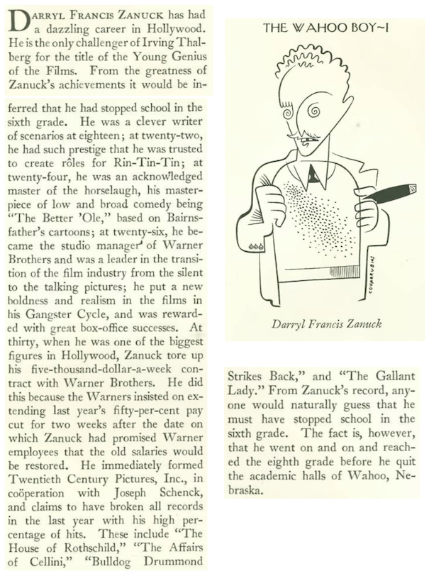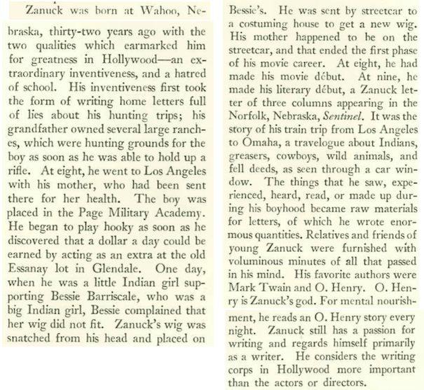 After writing dozens of scripts for Warner Brothers (including many for their popular canine star, Rin Tin Tin), in 1933 Zanuck would leave Warner and form 20th Century Pictures with Joseph Schenck. By the time Johnston penned the New Yorker profile, 20th Century had risen to be the most successful independent movie studio of its time.