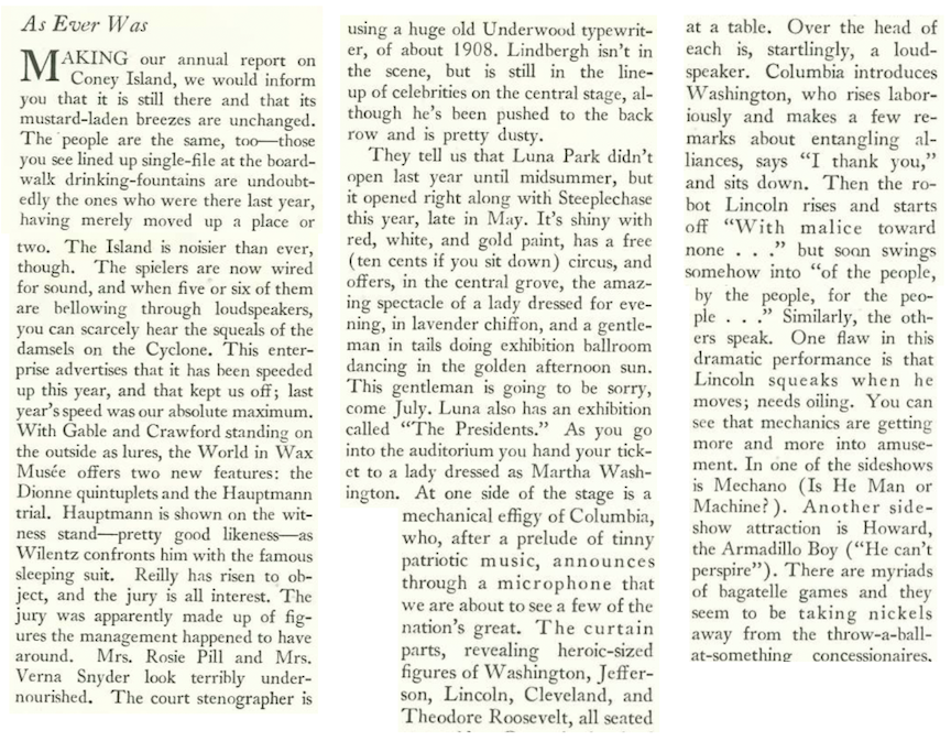 Paris correspondent Janet Flanner gave a rundown on the latest happenings, including the Toulouse-Lautrec costume ball that attracted none other than Jane Avril, the famed French can-can dancer of the 1890s who could still kick up her heels. Flanner gave Avril’s age at 80, but records indicate she was closer to 70.