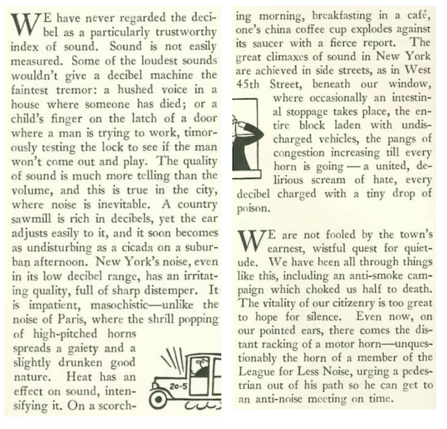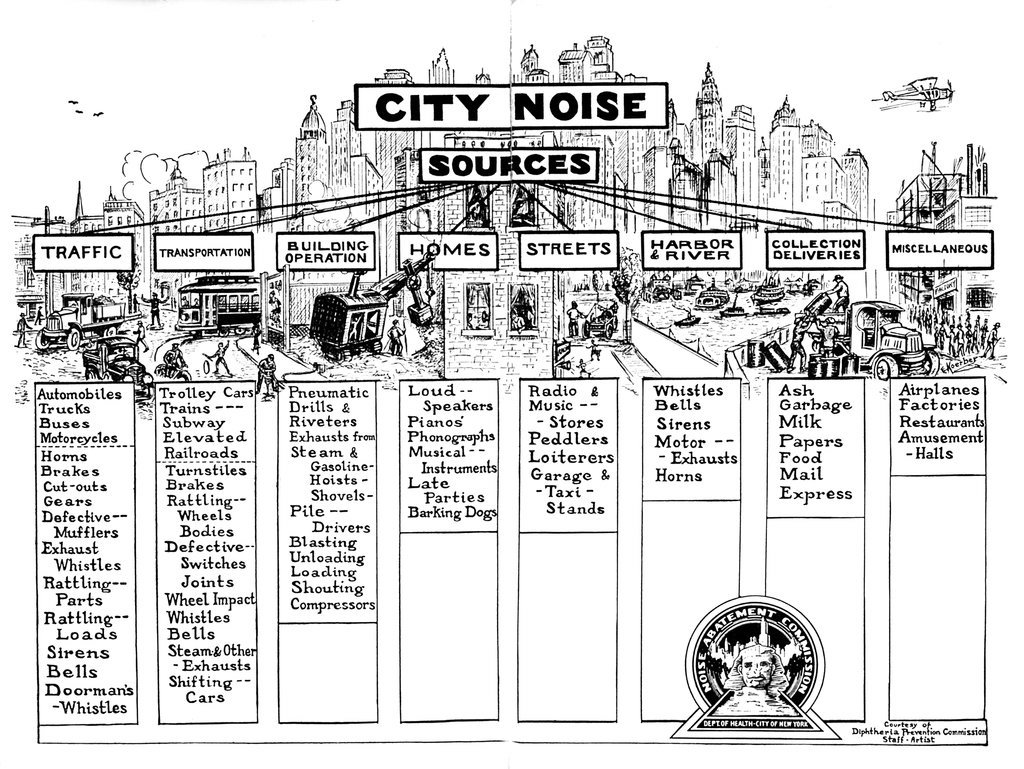 The city began addressing the problem in 1929, when New York City’s Commissioner of Health, Shirley Wynne (1882-1942), created a Noise Abatement Commission, likely the first such commission in the U.S. The Commission cited the “mounting roar and crash of traffic, building, manufacture and sundry other noises which have accompanied the growth of the city.” After eight months of research the Commission published City Noise, which included recommendations for a quieter city.