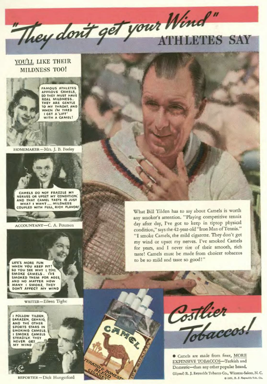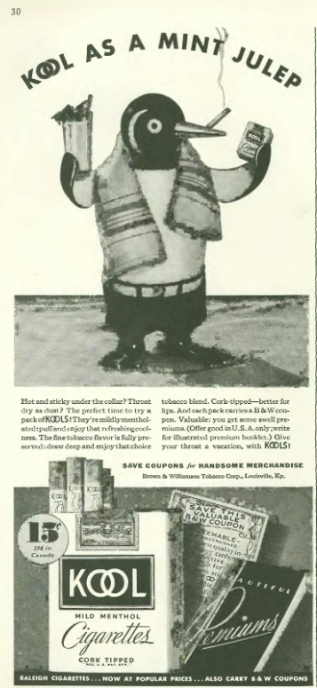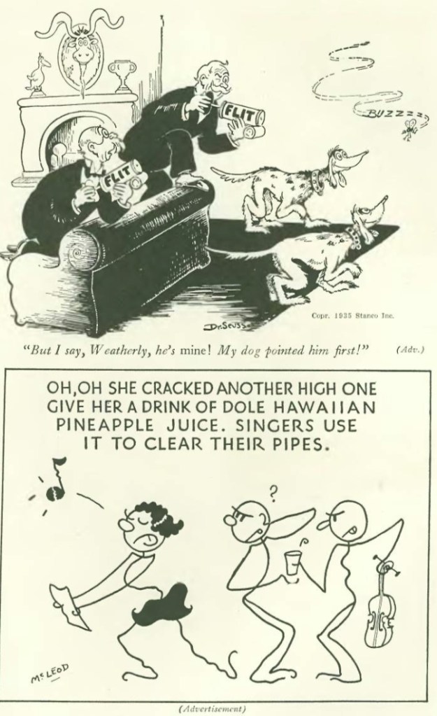 Colorful ads returned to the August 24 issue, featuring familiar sponsors who could afford full-page, full-color spots, namely tobacco and liquor producers…Camel was back with their athletic theme, however they might have chosen someone other than Bill Tilden, who looked perfectly ancient…
