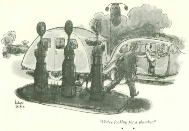 In his “Notes and Comment” column, E.B. White described the occasional “intestinal stoppage” of traffic outside The New Yorker’s offices at West 45th Street, an entire block “laden with undischarged vehicles, the pangs of congestion increasing till every horn is going—a united, delirious scream of hate, every decibel charged with a tiny drop of poison.”