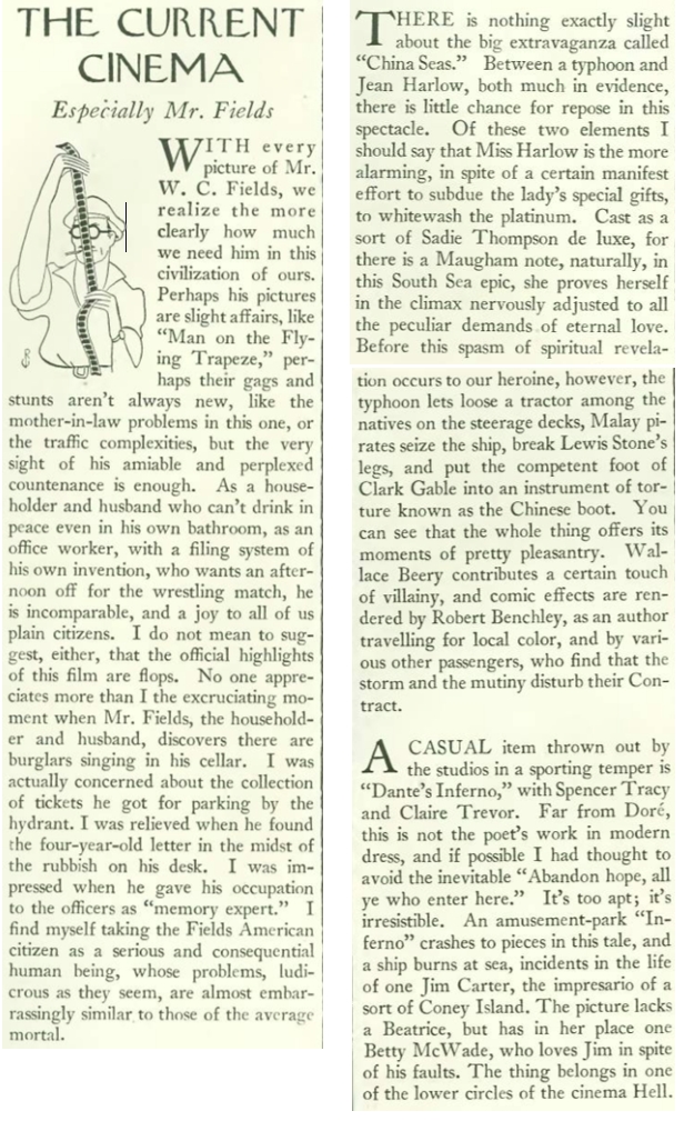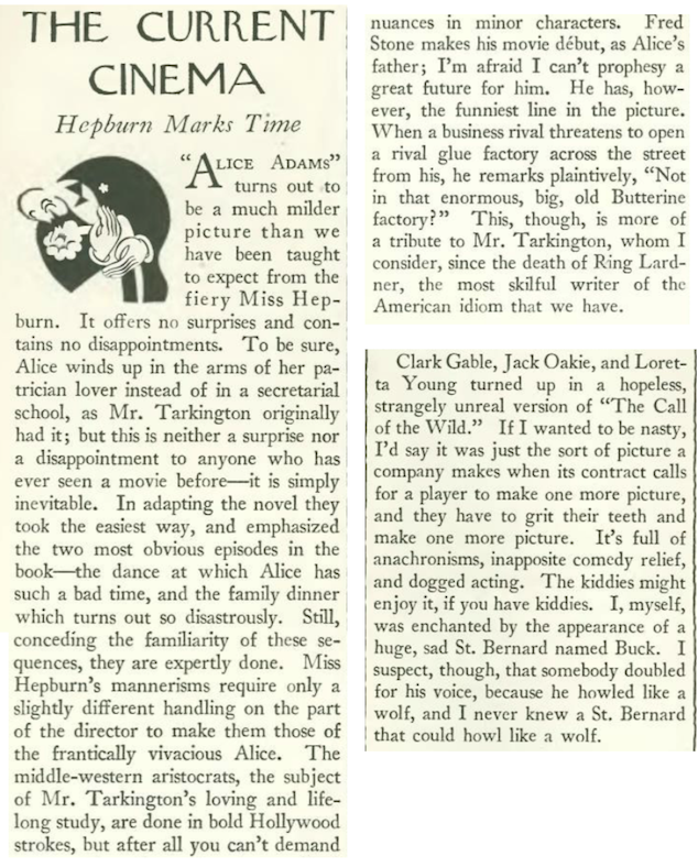 Film critic John Mosher continued to search in vain for a film he could endorse, but he came away empty-handed after screening a star-studded screen adaptation of Jack London’s novel The Call of the Wild. Star power also fell short for Mosher in the screen version of Booth Tarkington’s Alice Adams.