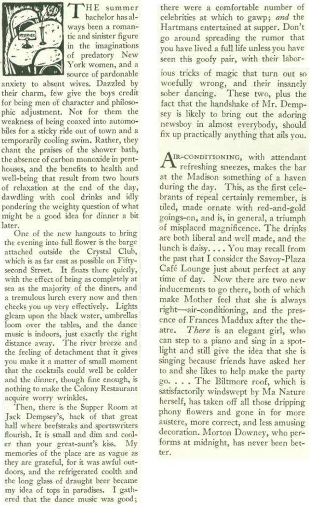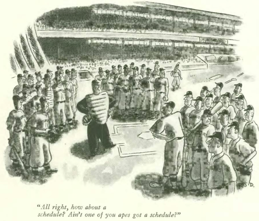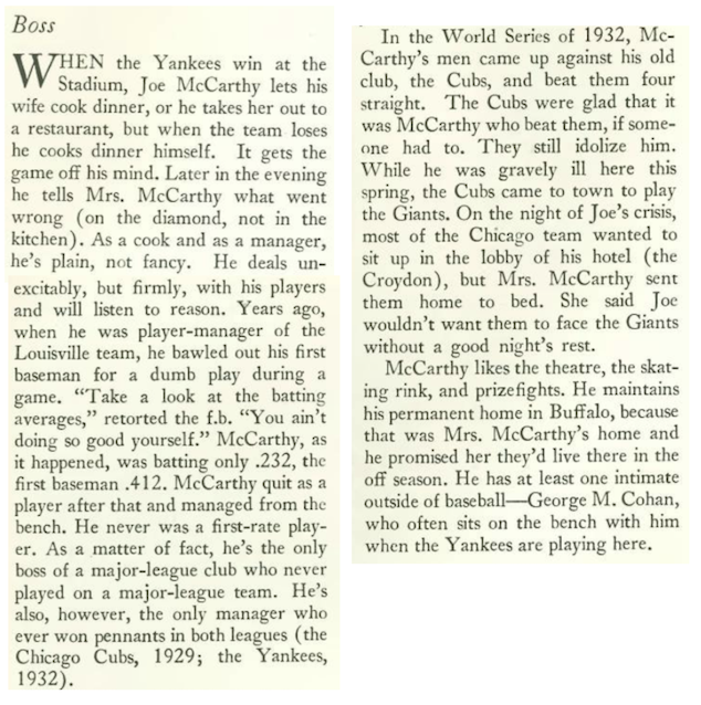 Before Roger Angell started writing about baseball in 1962, there wasn’t a whole lot written about the sport in the pages of The New Yorker. In the magazine’s early years, the game was probably perceived as too low-brow, while other athletic pursuits such as golf, tennis, and polo were more in line with the desired or perceived readership. Early contributors such as Ring Lardner had also soured on the sport, thanks to the Black Sox Scandal of 1919 and the greed of team owners. So here is a rare look at baseball, and Yankee coach Joe McCarthy (1887-1978), in “The Talk of the Town.” Excerpts: