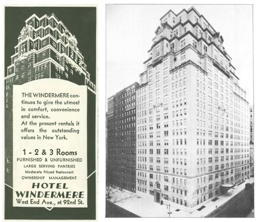 …the distinctive crown of Hotel Windemere on the Upper West Side was an eye-catcher even in this one-column ad from the back of the book…photo at right from around the time it was completed, 1927…
