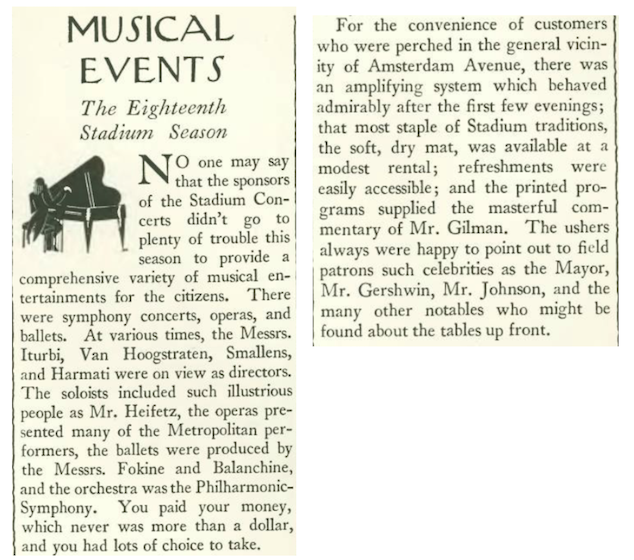 The monumental Lewisohn Stadium was a popular classical music venue on the City College of New York campus until its unfortunate demolition in 1973. According to BBC Music Magazine, “for nearly half a century, Lewisohn Stadium gave people from all walks of life the chance to hear performances by the likes of violinist Fritz Kreisler, soprano Leontyne Price and clarinettist Benny Goodman for as little as 25 cents admission. The New Yorker paid a visit during eighteenth season of the Stadium Concerts. Excerpts: