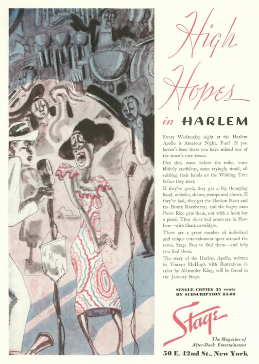 …the inside back cover belonged to Stage magazine…the illustration, “Amateur Night at the Apollo,” is by Alexander King…