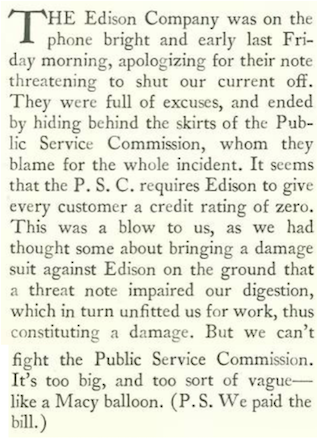 In the previous issue E.B. White noted that the Edison Company was threatening to cut off electric service to the magazine’s offices due to nonpayment. This “Notes and Comment” update cleared up the matter.