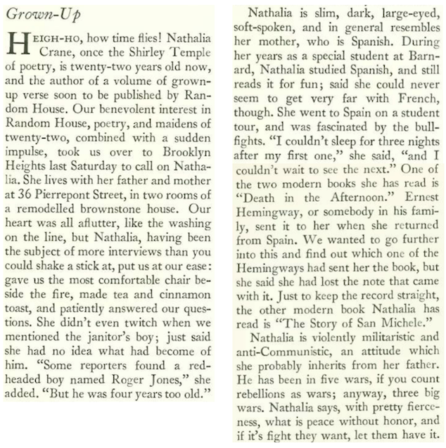 “The Talk of the Town” paid a visit to Nathalia Crane (1913–1998), who became famous after the 1924 publication of her first book of poetry, The Janitor’s Boy, at the age of ten. Excerpts: