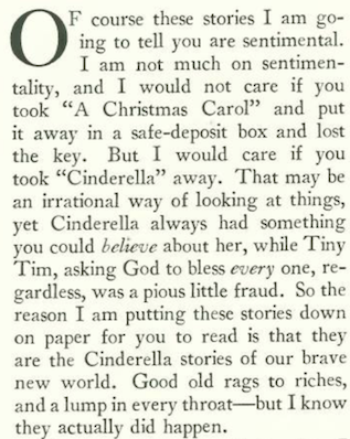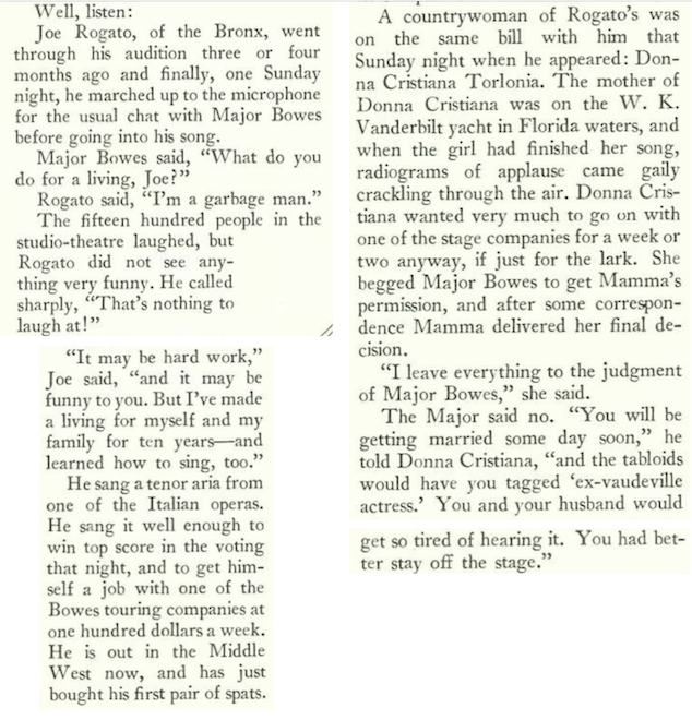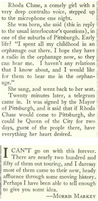 For his Jan. 4, 1936 “A Reporter at Large” column Morris Markey visited “Major Bowe’s Amateur Hour” at NBC’s Rockefeller Center radio studios. He was so impressed by the rags-to-riches stories that he shared a few in his Jan. 18 column, titled “The Crystal Slipper.” He warned readers that the stories were “sentimental,” but not in the vein of A Christmas Carol: “Tiny Tim, asking God to bless every one, regardless, was a pious little fraud,” Markey noted. Excerpts: