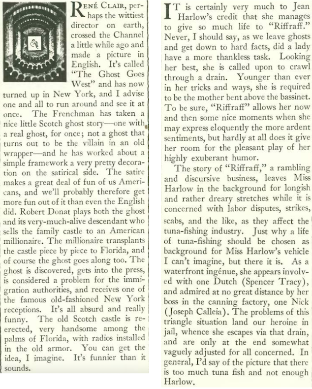 Film critic John Mosher found some bright spots at the movies, praising René Clair’s The Ghost Goes West but feeling sorry for Jean Harlow in her “thankless” role in Riffraff, a film about the tuna-fishing industry.