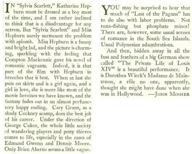 Mosher didn’t know what to make of Katharine Hepburn’s latest film, Sylvia Scarlett, in which she portrayed a con artist disguised as a boy hiding from the police. Despite its major star power and George Cukor as director, the film was a flop.