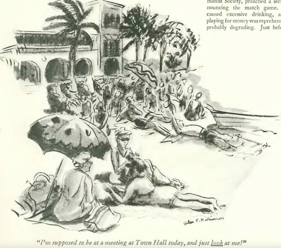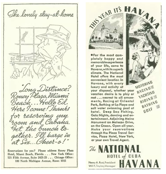 …a couple of ads from back of the book…at left, an Anglophilic appeal from Miami’s Roney Plaza Hotel, and, at right, pre-revolutionary days at the National Hotel in Havana (I had a drink there a few years ago during the Obama thaw…the lobby is beautiful, a classic from another era still hanging on thanks to Canadian and European tourists)…
