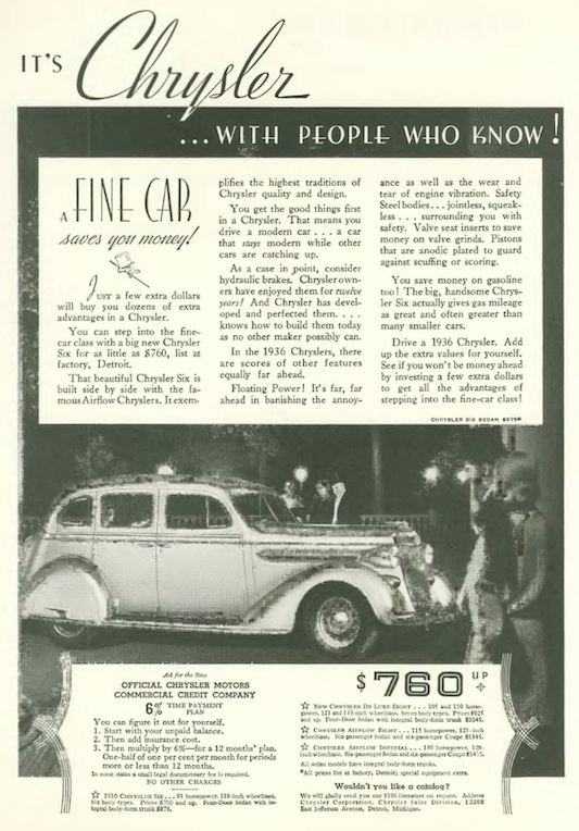 …with the holidays a memory and the Depression still lingering, most of the automobile ads touted economy over luxury, however Chrysler claimed you could have both with this $760 model…
