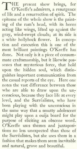 Mumford noted that O’Keeffe’s newer works revealed a “resurrection of spirit,” such as the painting of a ram’s skull, “with its horns acting like wings, lifted up against the gray, wind-swept clouds…”