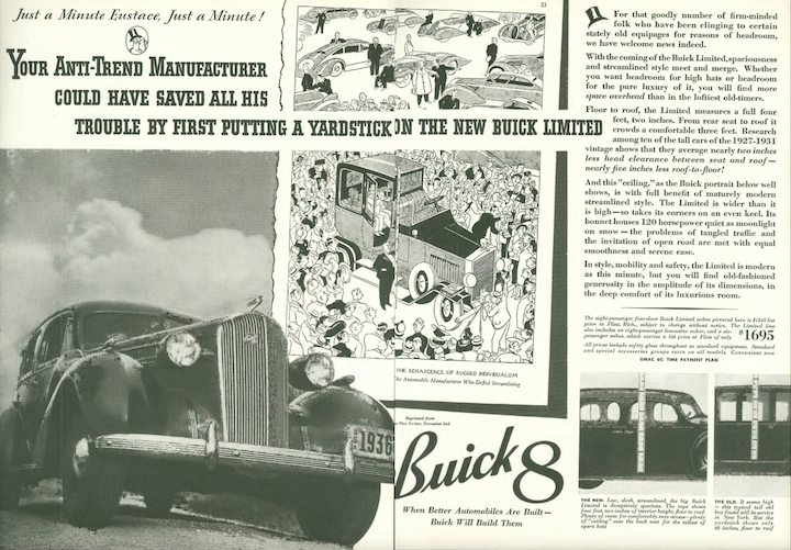 General Motors promoted their Buick Eight in a two-page advertisement that called out Eustace Tilley and reprinted a Carl Rose cartoon from the Nov. 2, 1935 issue…
