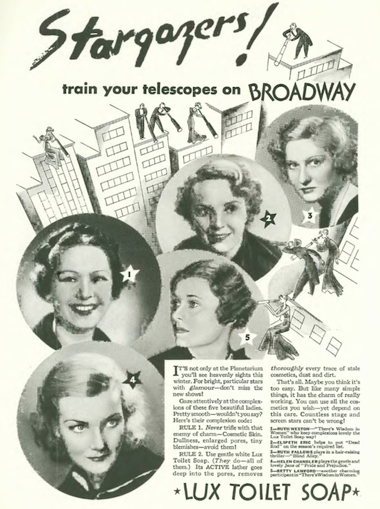 …the makers of Lux were still rolling out Broadway stars to endorse their toilet soap…(Betty Lawford, #5, was an English film and stage actress and a cousin of actor Peter Lawford)…
