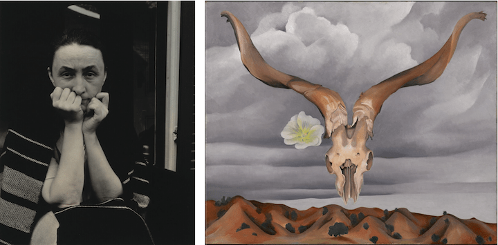 Above: Portrait of Georgia O'Keeffe, 1935, by Alfred Stieglitz, gelatin silver print; at right, O'Keeffe's Ram's Head, White Hollyhock-Hills, 1935. Oil on canvas. (National Gallery/Brooklyn Museum)