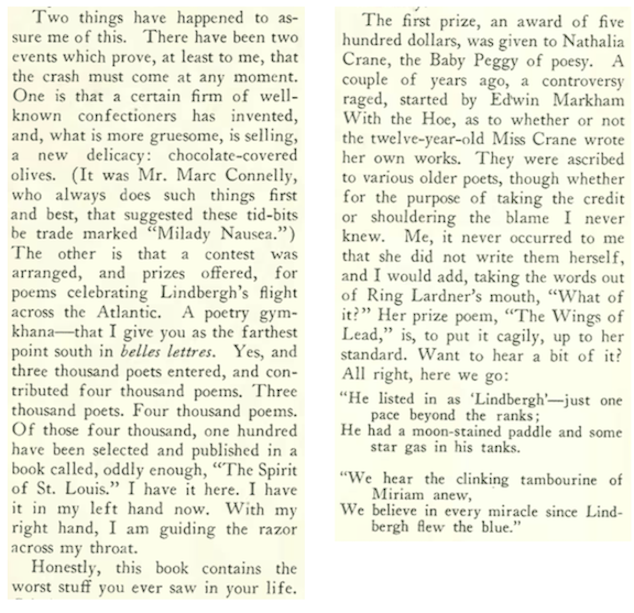 The fledgling Crane received a very different New Yorker reception in 1928, when Dorothy Parker took her to task for contributing to the collapse of grammar and civilization in general. Here’s an excerpt from Parker’s Jan. 7, 1928 “Reading & Writing” column: