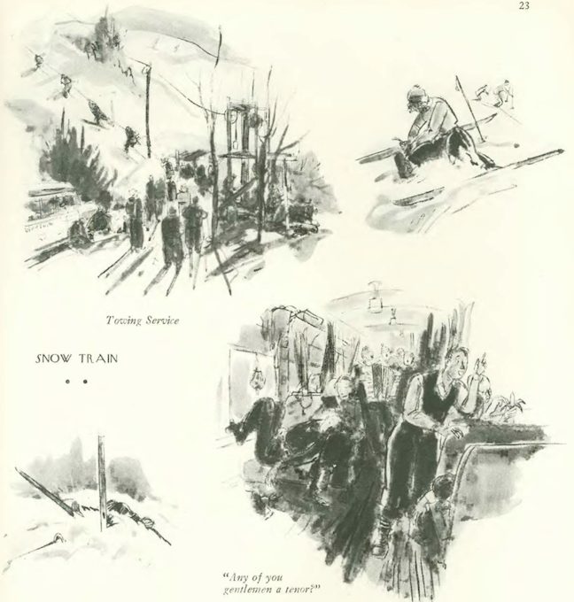Perry Barlow drew up two pages of scenes from Snow Trains that took thousands of skiers from Grand Central to the Berkshires and Adirondacks…
