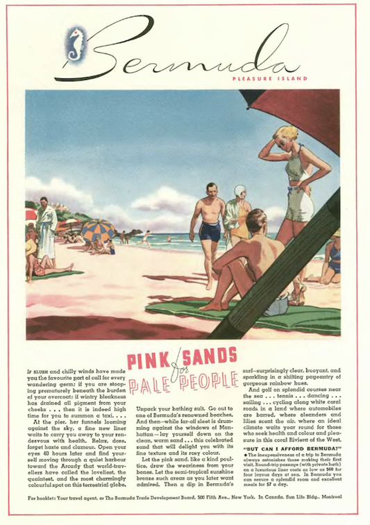 …this colorful ad from the Bermuda Trade Development Board beckoned New Yorkers to trade “slush and chilly winds” for the pink sands of the British island territory…