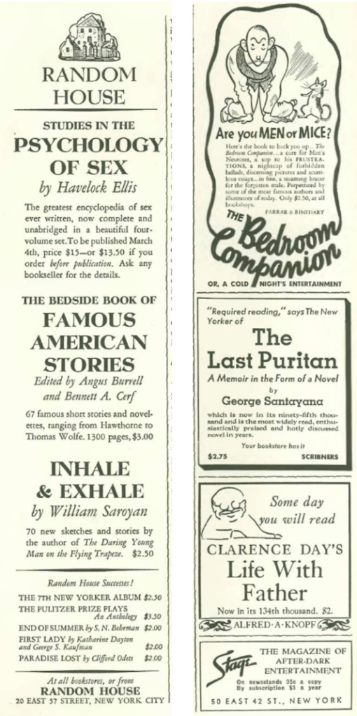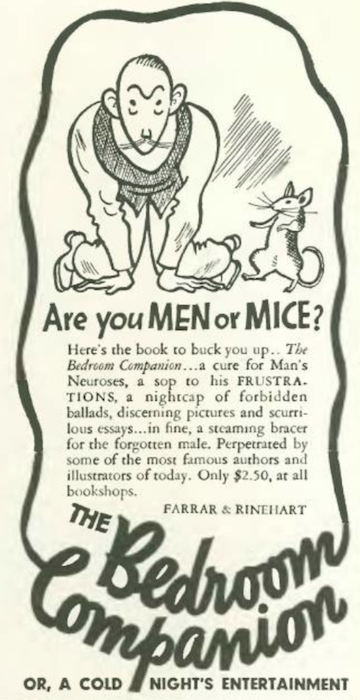LATE NIGHT READING…Clockwise, from top left, 1935 edition of The Bedroom Companion; a racy cartoon by Abner Dean; comic lyrics by Ogden Nash; a contribution by Vincenzo Zito, a well-known caricature artist who particularly favored dogs. (etsy.com)