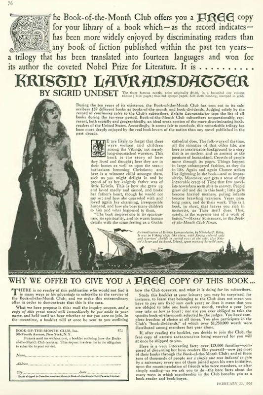 …Book-of-the-Month Club enticed new members with a FREE copy of the Nobel Prize-winning trilogy Kristin Lavransdatter by Danish-Norwegian author Sigrid Undset