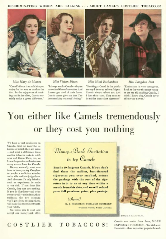…the back cover cycled back to Camel cigarettes with a lineup of fashionable debs enticing young women to join their ranks…as Camel smokers, at least…