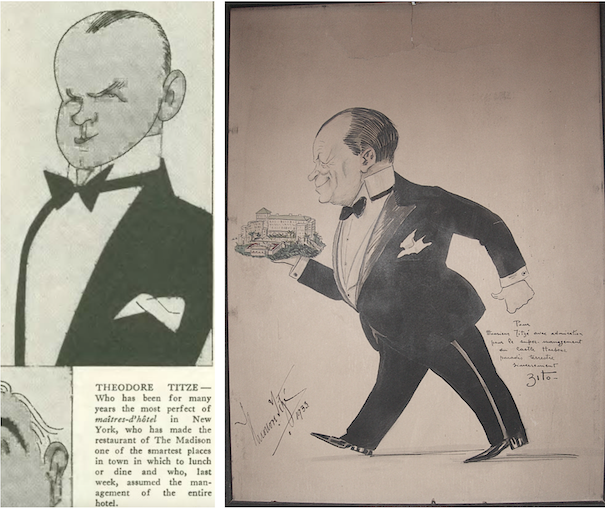 KNOWN AS THEODORE OF THE RITZ, the German-born Theodore Titze (1879–1953) was a well-known maitre d’hotel—at left, Ralph Barton featured Titze as one of his “Heroes of the Week” in the Dec. 12, 1925 issue of The New Yorker; at right, a 1933 drawing of Titze by the cartoonist Vinzento Zito—the image refers to Titze’s 1931 departure from New York to take charge of the Castle Harbor Hotel in Bermuda. He later operated other properties in Bermuda before opening Theodore’s at 4 East Fifty-sixth Street. (wikitree.com)