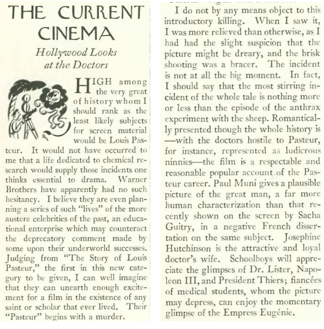 Paul Muni was considered one of the best actors of the 1930s, his talents so appreciated by Warner Brothers that he was allowed to choose his own roles, including the lead in The Story of Louis Pasteur. It was a good choice, as it landed him a Best Actor Oscar in 1936. New Yorker critic John Mosher had these observations: