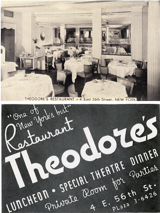 CAN’T MISS IT…Top, postcard image of Theodore’s Restaurant; below, ad for Theodore’s in Stage magazine, February 1938. (Etsy.com)