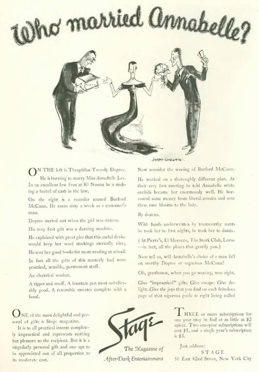 John Groth, who would contribute cartoons to The New Yorker in the 1940s, provided this illustration for a Stage magazine ad…