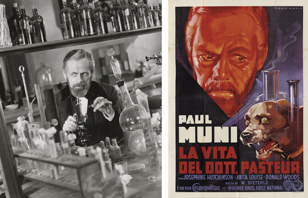 HE’S ON TO SOMETHING…Paul Muni in The Story of Louis Pasteur. One of the best posters for the film was the Italian version at right, the rabid dog promising some some real drama. Muni won the Best Actor Oscar of his portrayal of Pasteur. (researchgate.net/imdb.com)