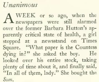 “The Talk of the Town” made brief mention of a rumor regarding Woolworth heiress Barbara Hutton’s health. Reports of her demise were premature; she died in 1979.