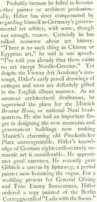 Flanner also noted the Führer’s early days as an unsuccessful painter, and an odd wedding gift to his buddy Hermann Göring: