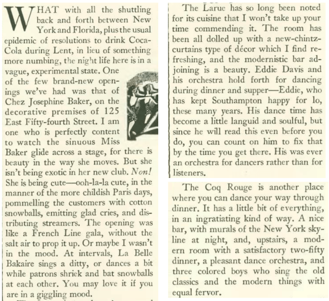 Above: Nightlife correspondent Lois Long checked out the latest clubs as well as old-time favorites in her column "Tables for Two." From left, advertisement for Restaurant Larue; Josephine Baker in 1937; and the entrance to Monte Proser's Beachcomber, an early iteration of the tiki bar that would become ubiquitous in midcentury America. (eBay.com/Wikipedia/mytiki.life)