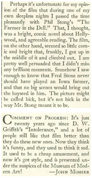 Mosher also commented on a film he walked out on (The Farmer in the Dell), and considered the twentieth anniversary of Intolerance, a 1916 drama that had become a “cheap amusement.”