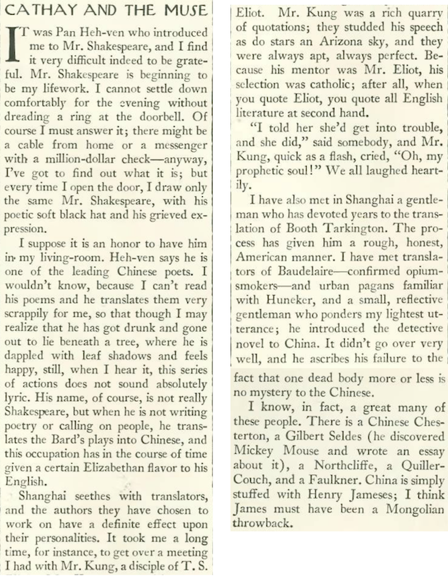 Supporting herself as a writer for The New Yorker, Emily Hahn’s years in Shanghai, China (1935 to 1941) were tumultuous. Living in the city’s red light district, she became romantically involved with the Chinese poet and publisher Shao Xunmei (aka Sinmay Zau) and became addicted to opium. In this excerpted short essay, Hahn described her literary encounters with Shao Xunmei (here referred to as “Pan Heh-ven”) and a passel of translators.