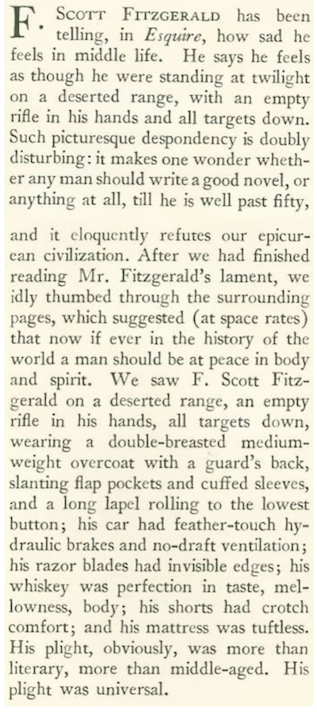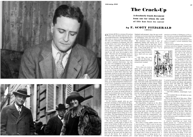 E.B. White (in “Notes and Comment”) referred to confessional essays published in Esquire magazine by F. Scott Fitzgerald that frankly described his struggles with alcoholism and the decline of his literary reputation. The confessional tone of the essays (three in all, published in February, March and April 1936) proved controversial at the time.
