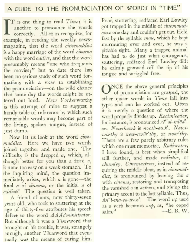 New Yorker writers rarely missed an opportunity to poke fun of Time magazine’s unique ways with the English language. E.B. White again, in an excerpt:
